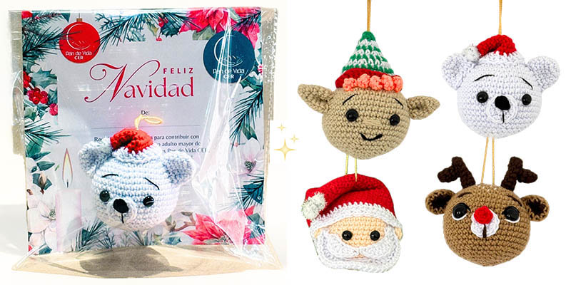 Incluye un decorativo* —reno, oso, duende o Papá Noel— tejido en técnica amigurumi, y un bono solidario que representa medio mes de alimentación para uno de nuestros beneficiarios.