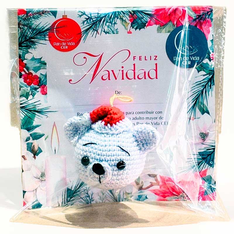 Incluye un decorativo* —reno, oso, duende o Papá Noel— tejido en técnica amigurumi, y un bono solidario que representa medio mes de alimentación para uno de nuestros beneficiarios.