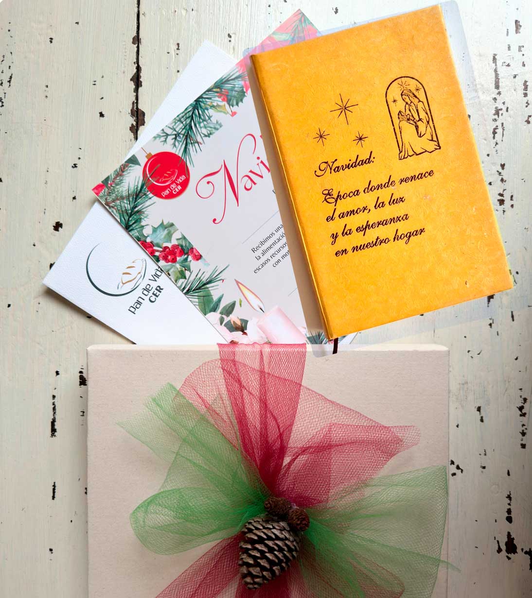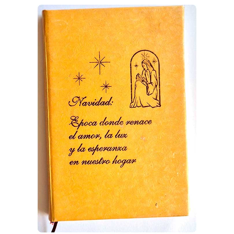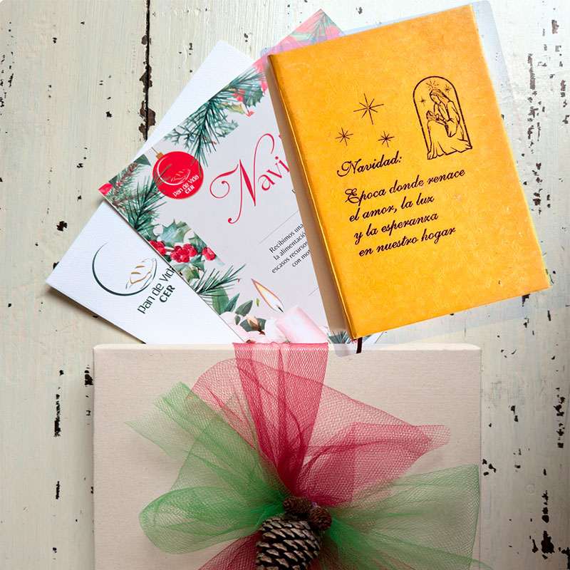 Incluye una caja decorada con la Novena de Navidad en pasta dura y un bono solidario que representa quince días de alimentación para uno de nuestros beneficiarios..